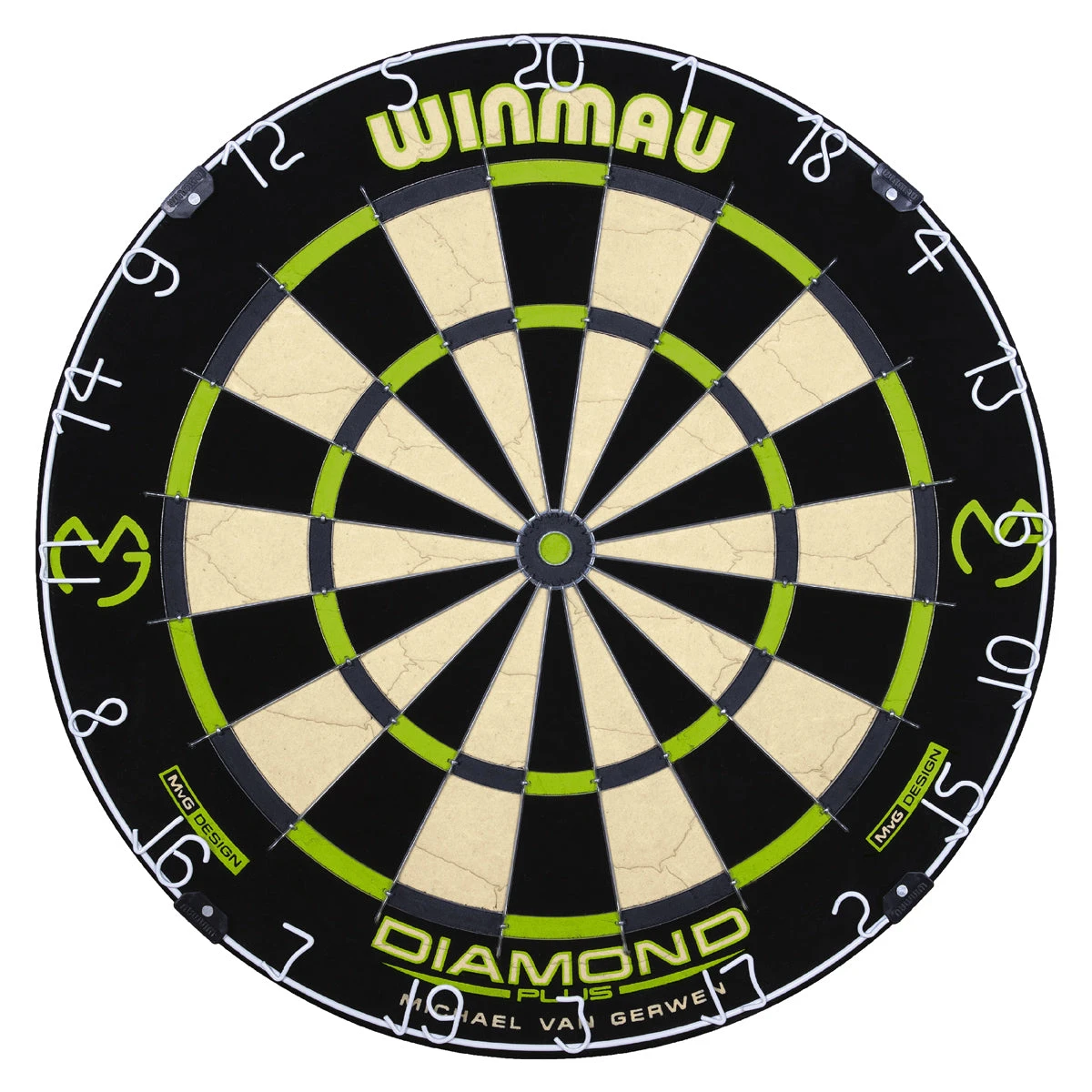 Geared for the modern game at the most advanced level, this refined triangular wire MvG Diamond Plus gives you dramatically improved durability and playability featuring Winmau’s high tensile Dynamic Sector Wiring. Made to World Darts Federation standards, this tournament approved dartboard is finished with hi-visibility scoring zones and anti-glare number ring for world class performance.