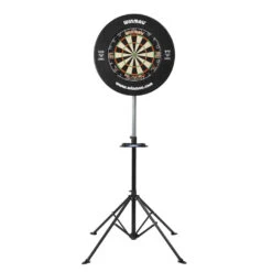 Winmau Xtreme Dartboard Stand – A portable and compact unit to allow you to play wherever you go. This robust black steel stand (now featuring 4 legs for additional stability) is adjustable with a lockable height setting so that you can always get a perfect dartboard height, even if the floor is uneven. Easy to assemble, including a wall support stabiliser to reduce movement, plus an accessory tray to provide a storage area. A dartboard surround can be fitted to the dartboard (excluding the Winmau Rebel) to provide protection for walls.